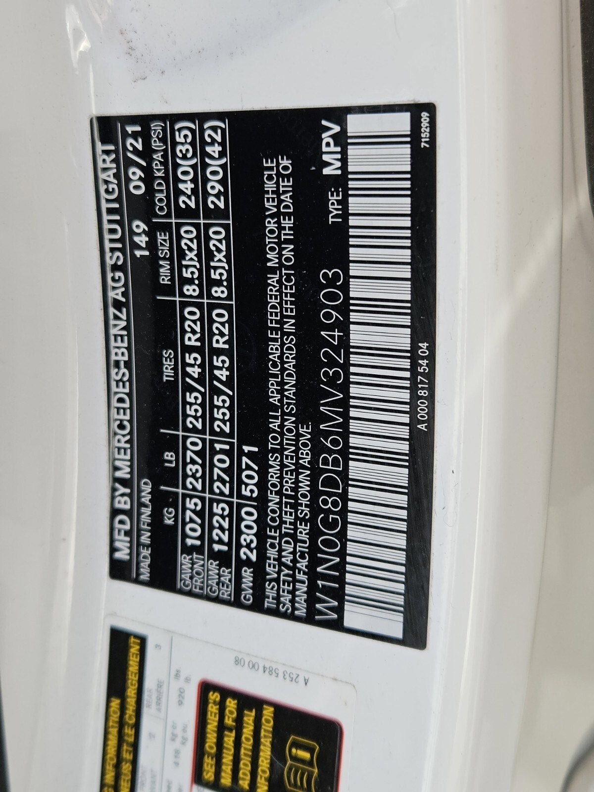 - Front Tire Size: P255/45VR20
